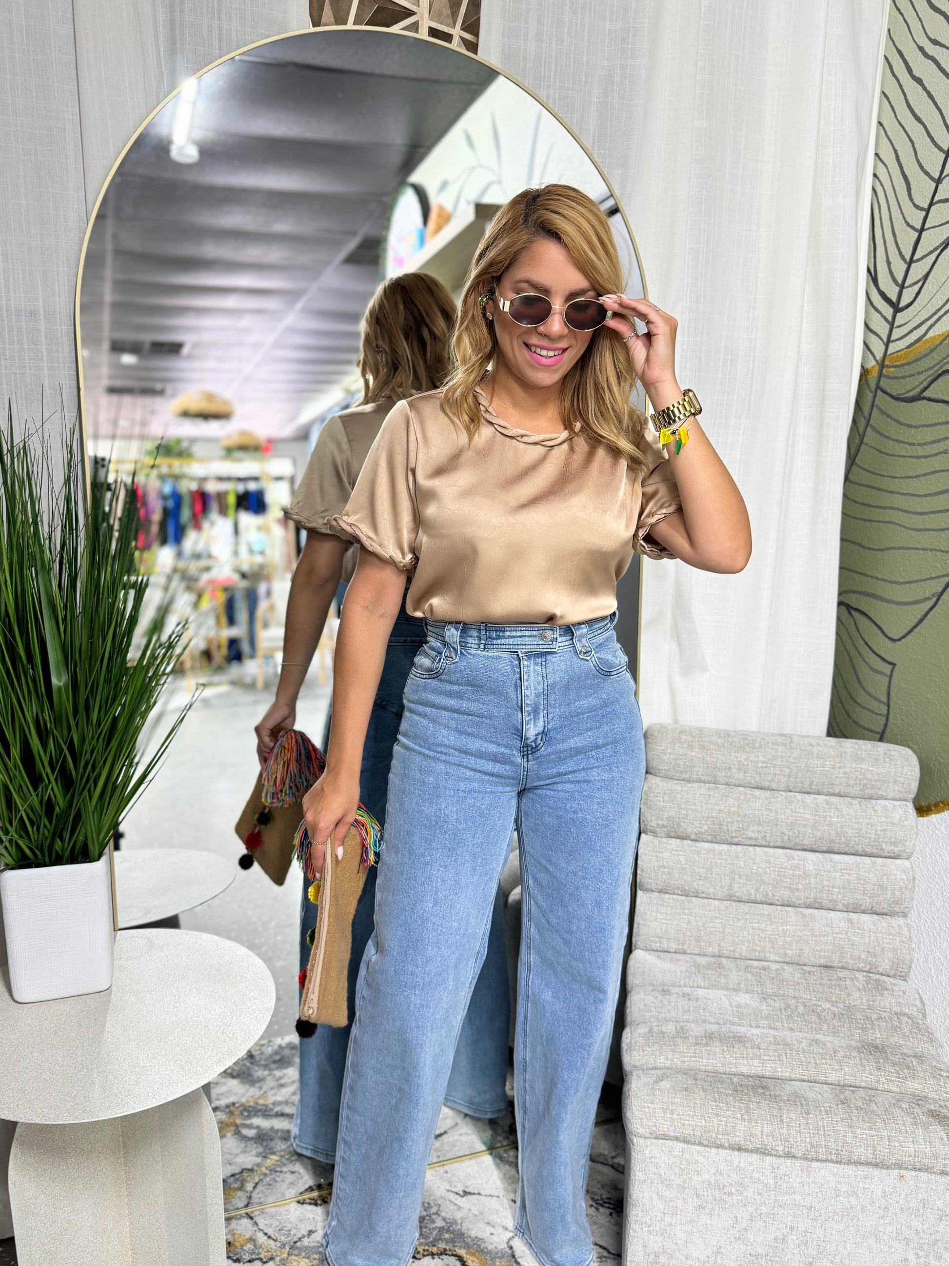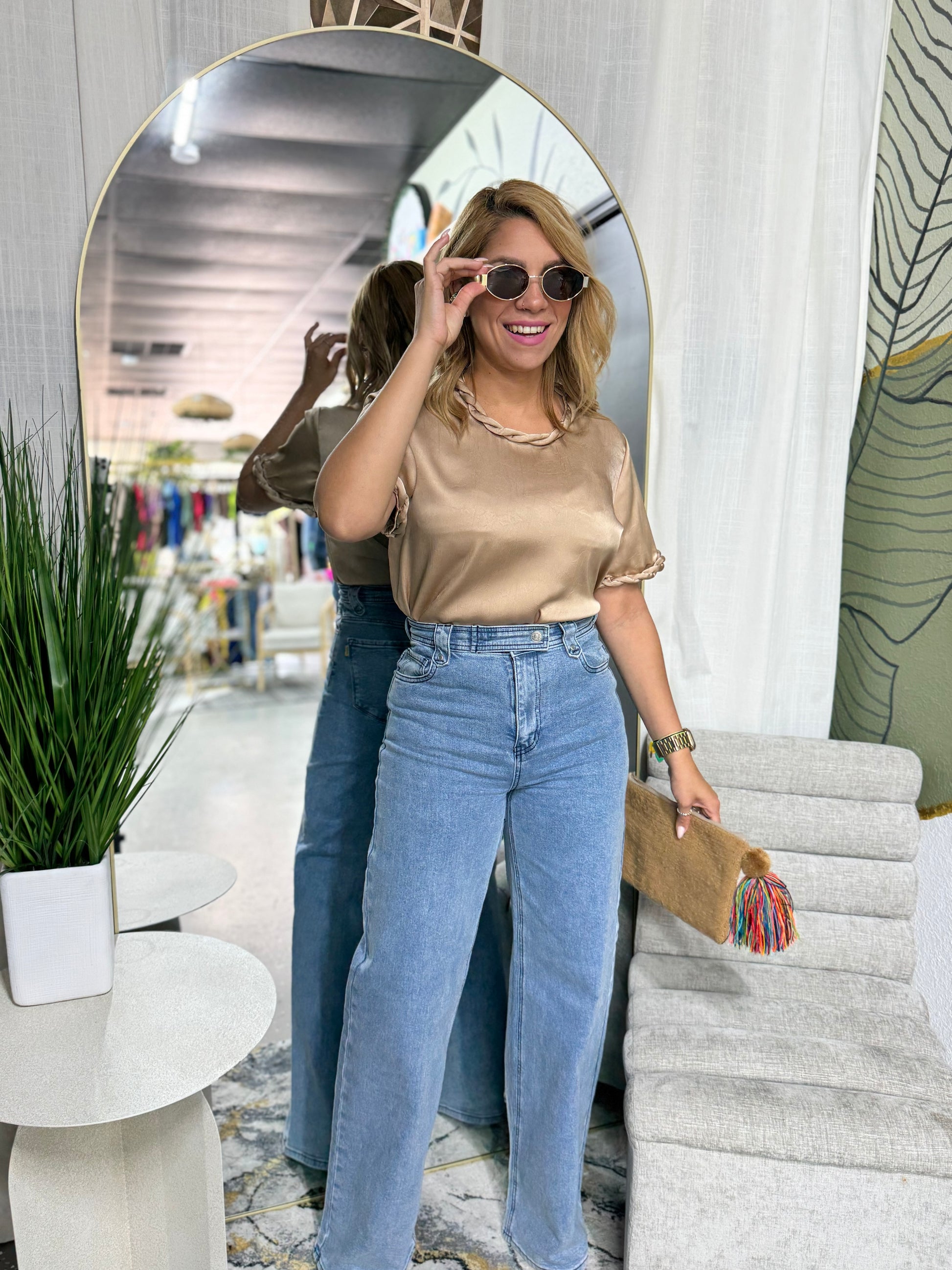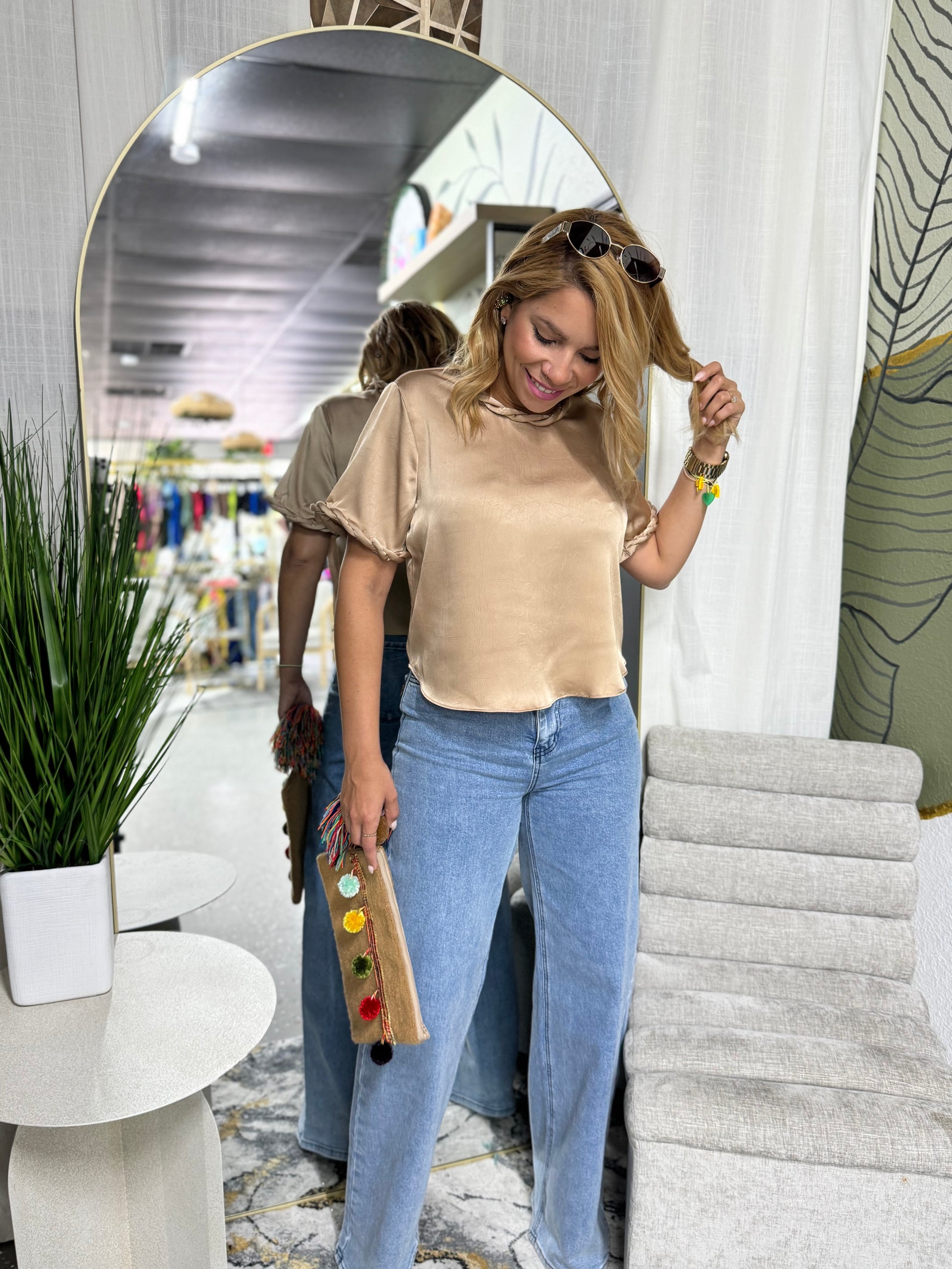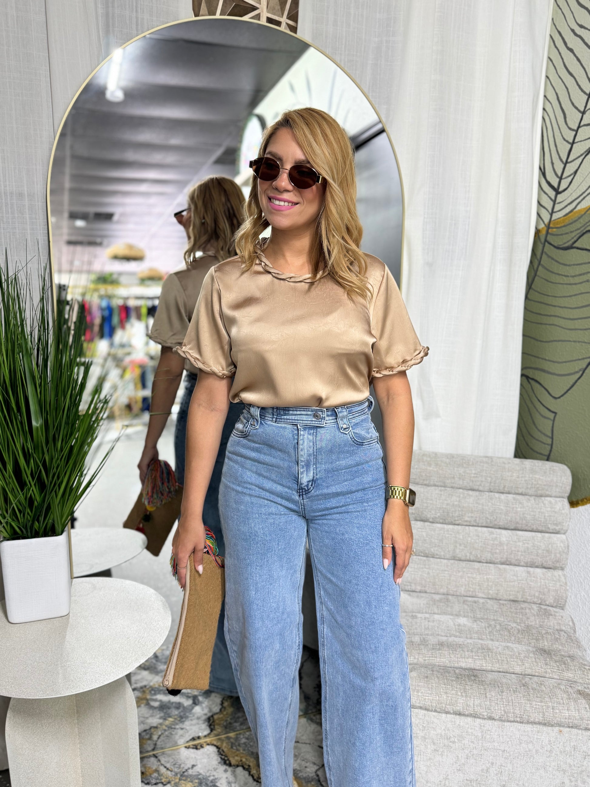 Talla utilizada SMALL. Estatura 5'3. Top sin stretch. Tela Satinada mas gruesa.