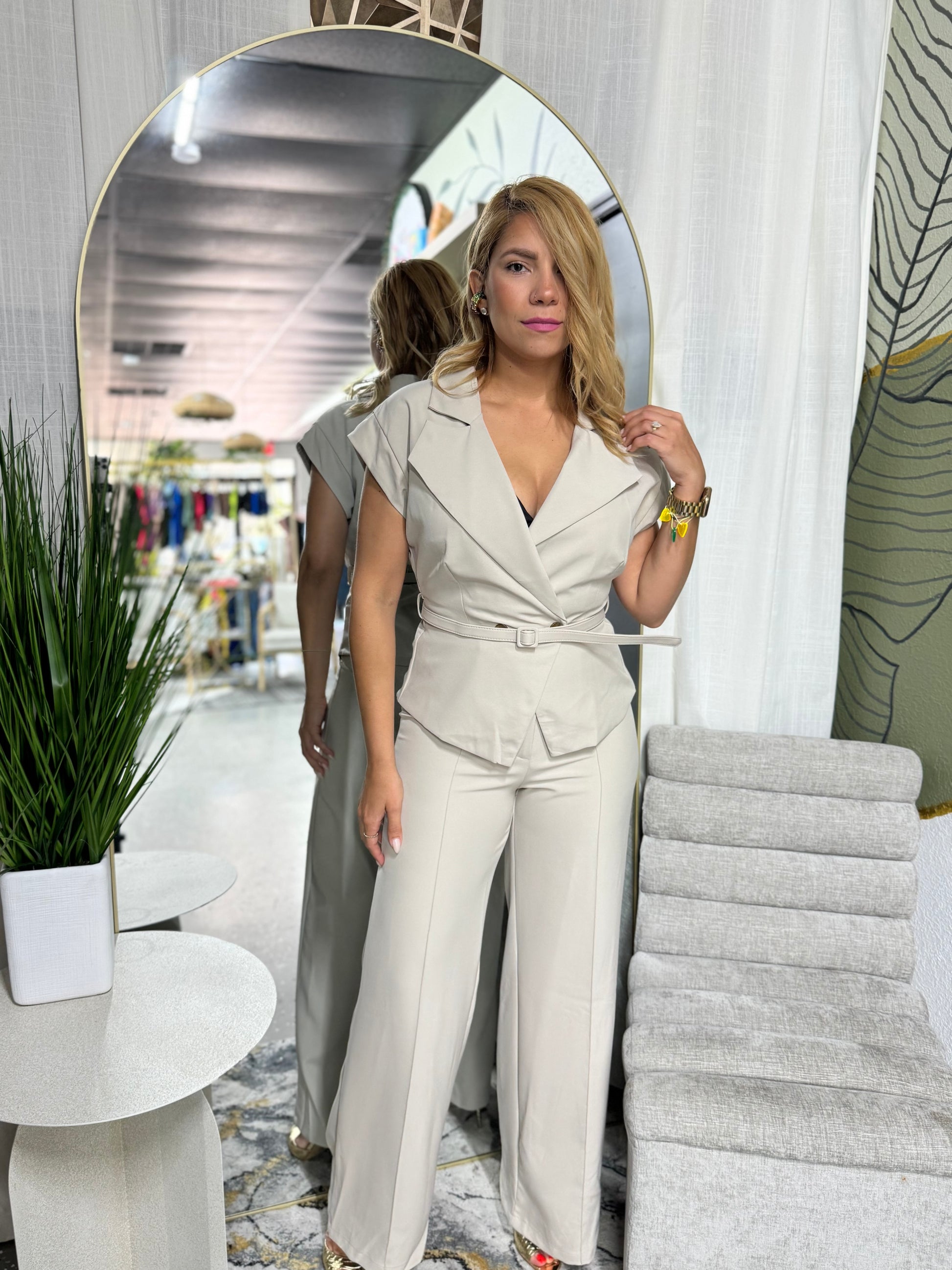 Talla utilizada SMALL. Estatura 5'3. Pantalon Tiene stretch en la cintura, pantalon alto en la cintura. Top tiene stretch atras en la cintura. Trae correa
