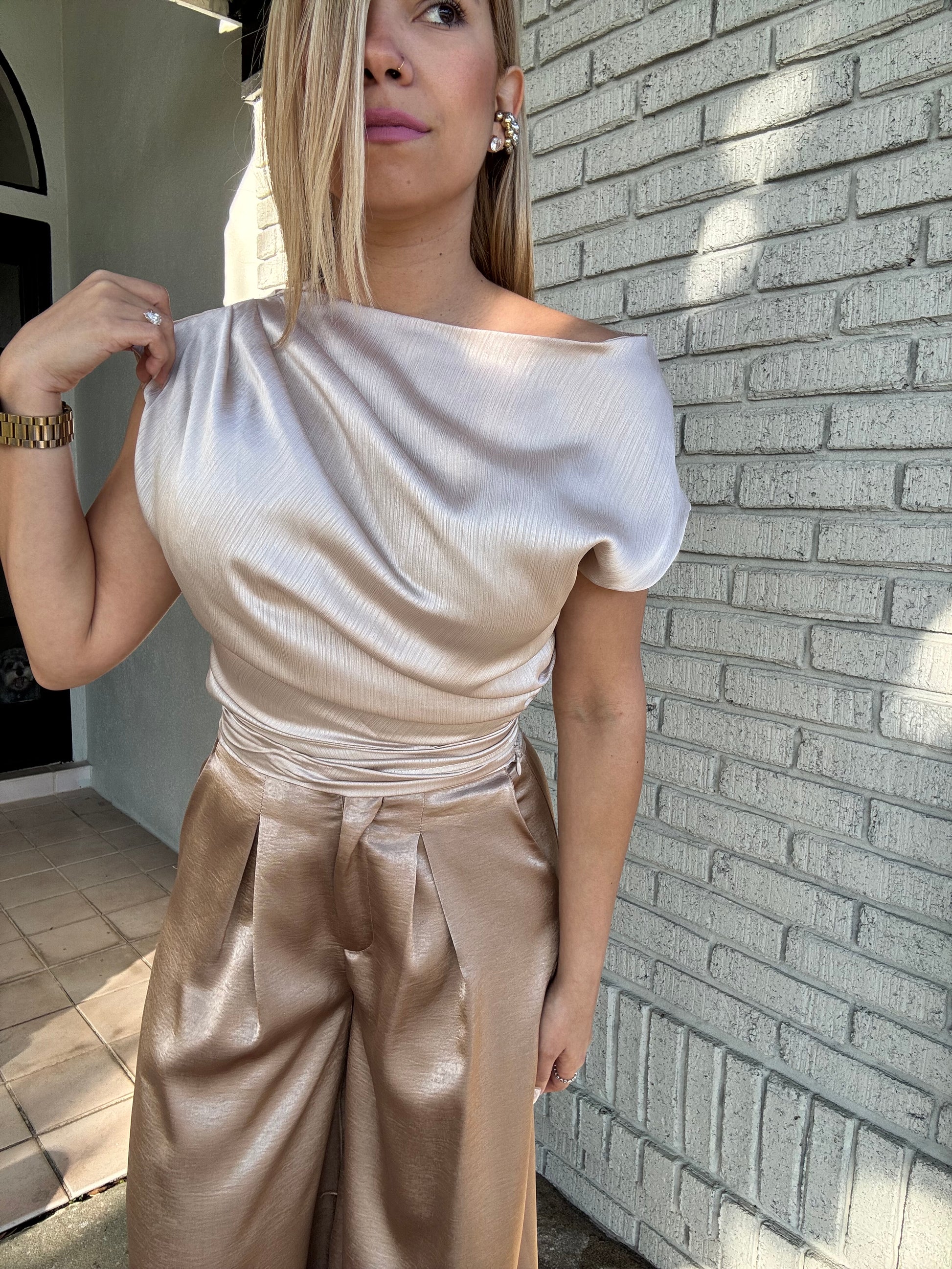 Talla  utilizada Small. Estatura 5'3.Tela satinada, ajusta en la cintura de varias formas,tiene zipper por el lado, corte asimetrico